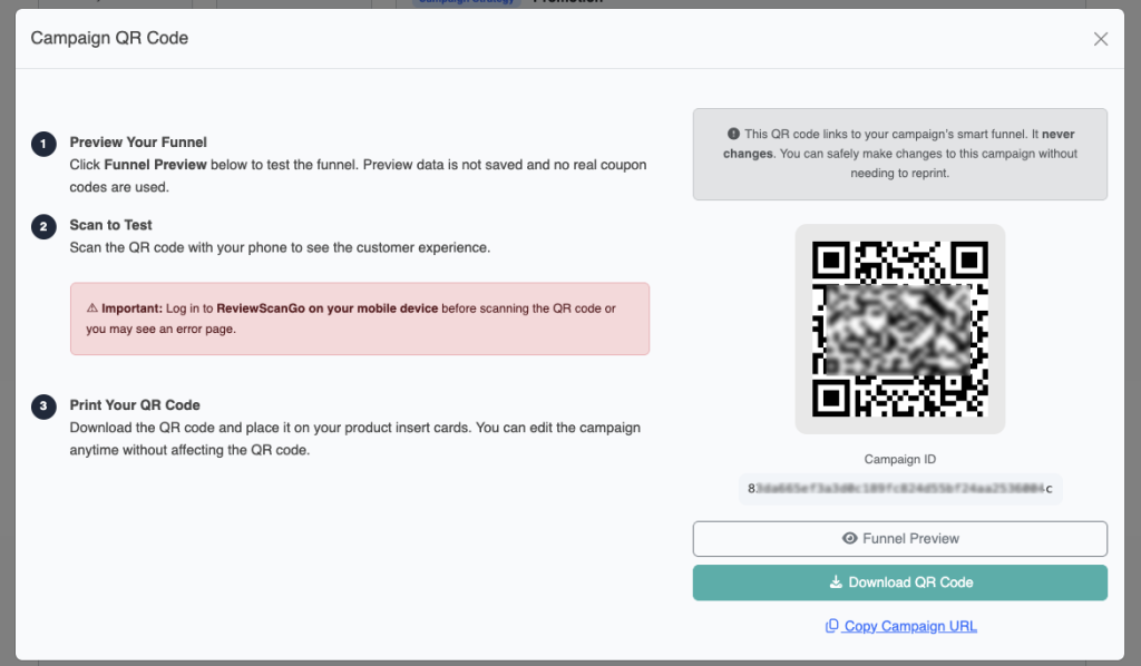 You can downloand the QR Code by clicking on the Download button at the bottom of the Edit Campaign page. Print the QR code on your product insert cards or product packaging. You can even email the QR code or campaign URL directly to your customers.