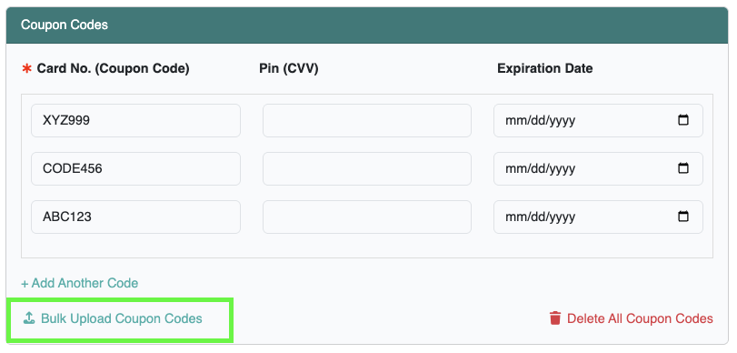 Coupon Code, Pin, Expiration Date (Download Example CSV file)